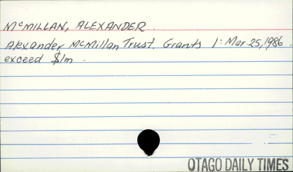 Dunedin Public Libraries (6th Apr 2021). McMillan, Alexander. In Website Dunedin Public Libraries. Retrieved 21st Apr 2026 00:30, from https://dunedin.recollect.co.nz/nodes/view/177690