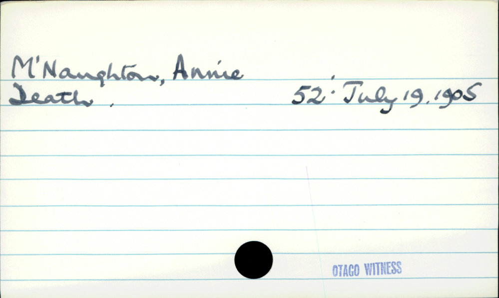 Dunedin Public Libraries (10th Apr 2021). M'Naughton, Annie. In Website Dunedin Public Libraries. Retrieved 27th Mar 2026 02:14, from https://dunedin.recollect.co.nz/nodes/view/178034