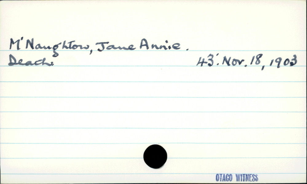 Dunedin Public Libraries (10th Apr 2021). M'Naughton, Jane Annie. In Website Dunedin Public Libraries. Retrieved 27th Mar 2026 02:06, from https://dunedin.recollect.co.nz/nodes/view/178044