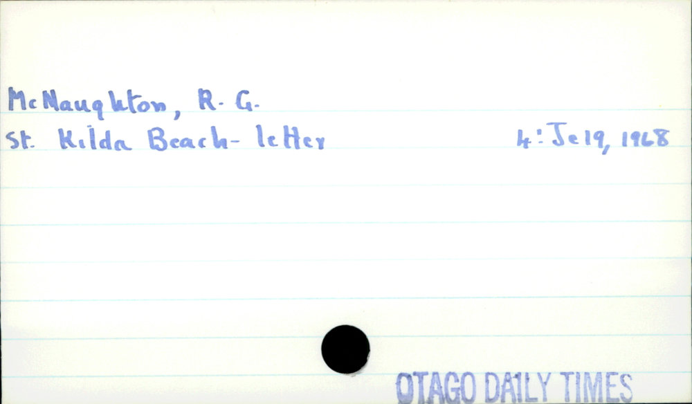 Dunedin Public Libraries (10th Apr 2021). McNaughton, R G. In Website Dunedin Public Libraries. Retrieved 27th Mar 2026 02:06, from https://dunedin.recollect.co.nz/nodes/view/178049