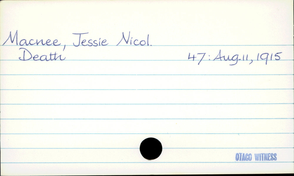 Dunedin Public Libraries (10th Apr 2021). Macnee, Jessie Nicol. In Website Dunedin Public Libraries. Retrieved 27th Mar 2026 02:07, from https://dunedin.recollect.co.nz/nodes/view/178057