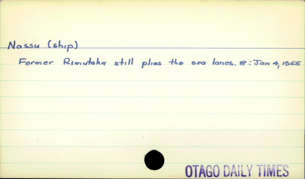Dunedin Public Libraries (11th Aug 2021). Nassu (ship). In Website Dunedin Public Libraries. Retrieved 26th Apr 2026 05:32, from https://dunedin.recollect.co.nz/nodes/view/187680
