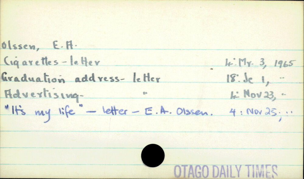 Dunedin Public Libraries (17th Sep 2021). Olssen, E.A.. In Website Dunedin Public Libraries. Retrieved 27th Mar 2026 02:05, from https://dunedin.recollect.co.nz/nodes/view/192147