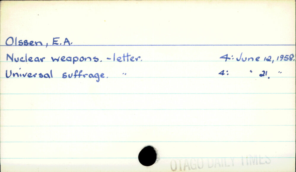 Dunedin Public Libraries (17th Sep 2021). Olssen, E.A.. In Website Dunedin Public Libraries. Retrieved 27th Mar 2026 02:05, from https://dunedin.recollect.co.nz/nodes/view/192152