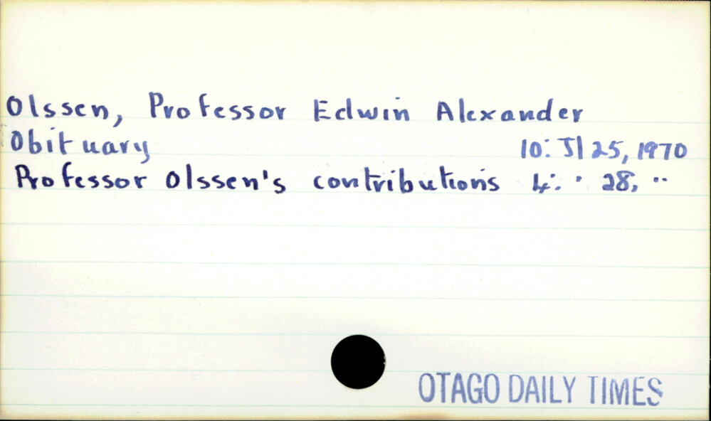 Dunedin Public Libraries (17th Sep 2021). Olssen, Professor Edwin Alexander. In Website Dunedin Public Libraries. Retrieved 27th Mar 2026 02:05, from https://dunedin.recollect.co.nz/nodes/view/192155