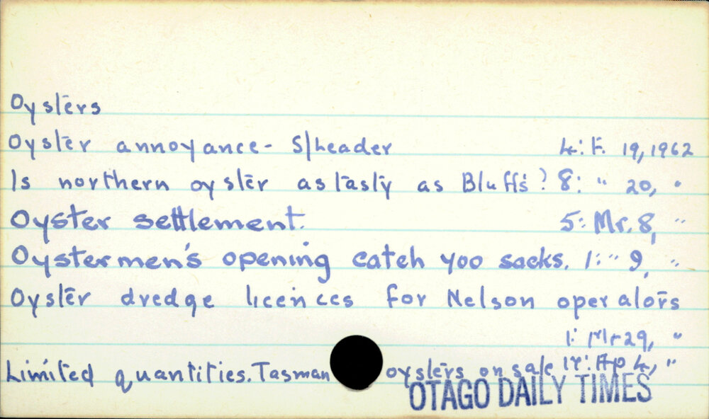 Dunedin Public Libraries (21st Oct 2021). Oysters. In Website Dunedin Public Libraries. Retrieved 6th Apr 2026 04:27, from https://dunedin.recollect.co.nz/nodes/view/194968