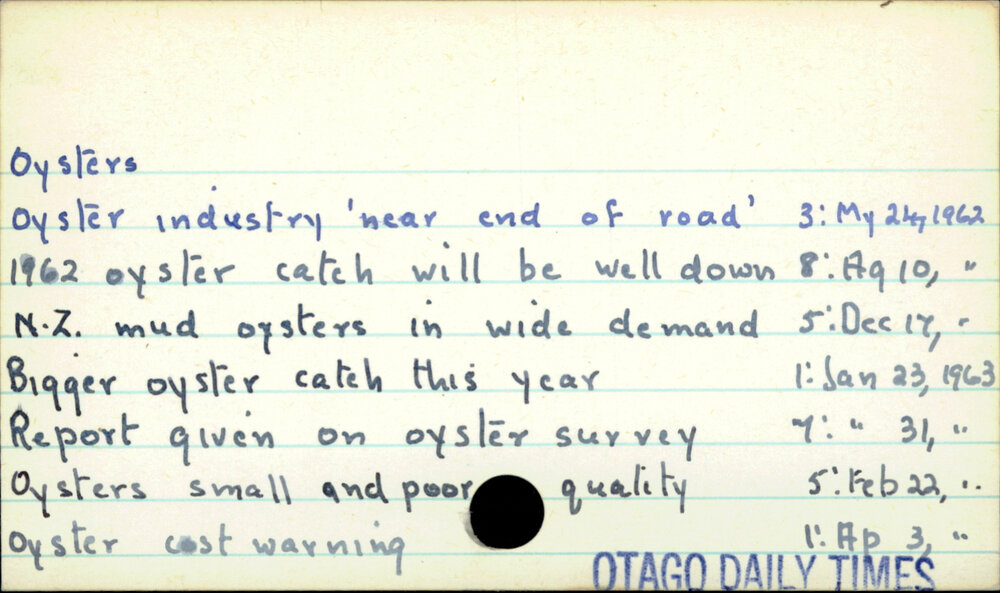 Dunedin Public Libraries (21st Oct 2021). Oysters. In Website Dunedin Public Libraries. Retrieved 6th Apr 2026 04:36, from https://dunedin.recollect.co.nz/nodes/view/194972