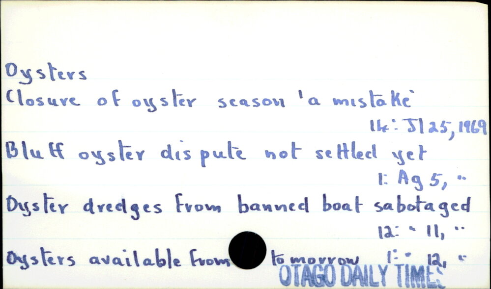 Dunedin Public Libraries (21st Oct 2021). Oysters. In Website Dunedin Public Libraries. Retrieved 6th Apr 2026 04:26, from https://dunedin.recollect.co.nz/nodes/view/194979