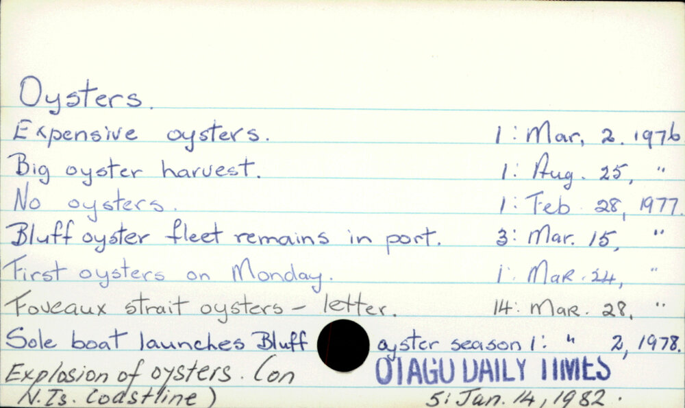Dunedin Public Libraries (21st Oct 2021). Oysters. In Website Dunedin Public Libraries. Retrieved 6th Apr 2026 04:27, from https://dunedin.recollect.co.nz/nodes/view/194988