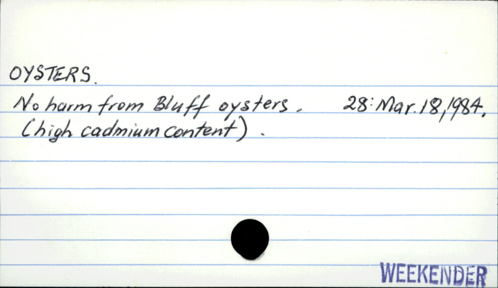 Dunedin Public Libraries (21st Oct 2021). OYSTERS. In Website Dunedin Public Libraries. Retrieved 6th Apr 2026 04:28, from https://dunedin.recollect.co.nz/nodes/view/194990