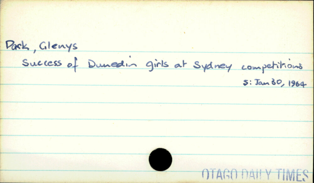 Dunedin Public Libraries (3rd Nov 2021). Park, Glenys. In Website Dunedin Public Libraries. Retrieved 9th Apr 2026 19:25, from https://dunedin.recollect.co.nz/nodes/view/195817
