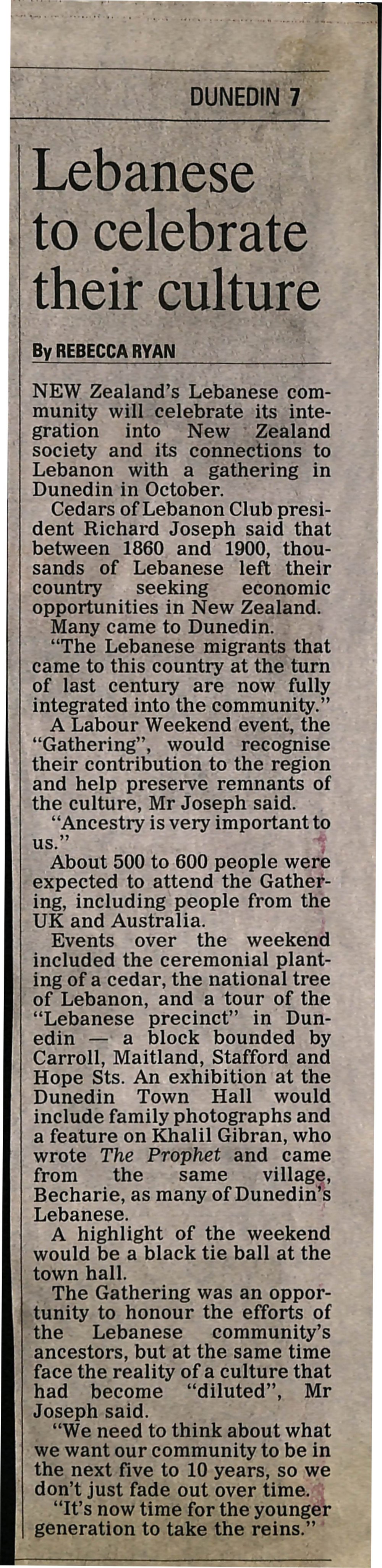 Dunedin Public Libraries (5th Apr 2018). Lebanese to celebrate their culture. In Website Dunedin Public Libraries. Retrieved 20th Apr 2026 08:04, from https://dunedin.recollect.co.nz/nodes/view/200308