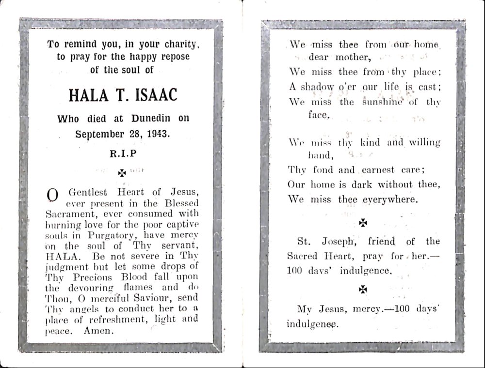 Dunedin Public Libraries (12th Apr 2018). Hala Isaac memorium . In Website Dunedin Public Libraries. Retrieved 12th Apr 2026 07:10, from https://dunedin.recollect.co.nz/nodes/view/201330