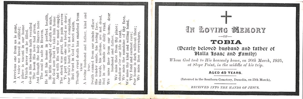 Dunedin Public Libraries (12th Apr 2018). Tobia Isaac memorium card. In Website Dunedin Public Libraries. Retrieved 12th Apr 2026 07:09, from https://dunedin.recollect.co.nz/nodes/view/201331