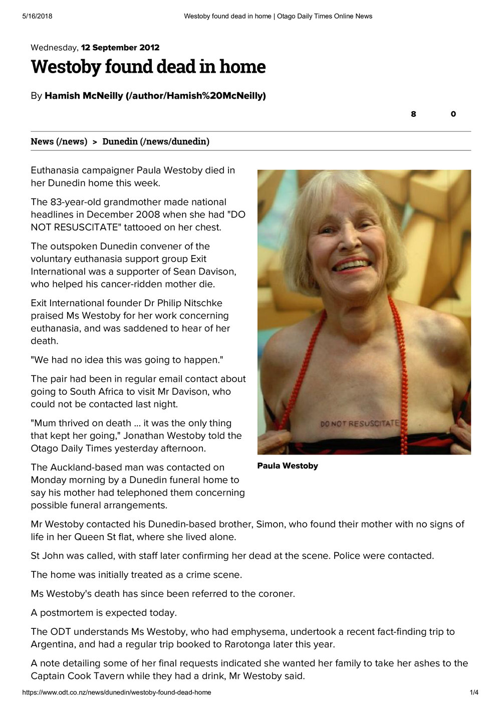 Dunedin Public Libraries (16th May 2018). Westoby found dead in home. In Website Dunedin Public Libraries. Retrieved 12th Apr 2026 07:10, from https://dunedin.recollect.co.nz/nodes/view/201793