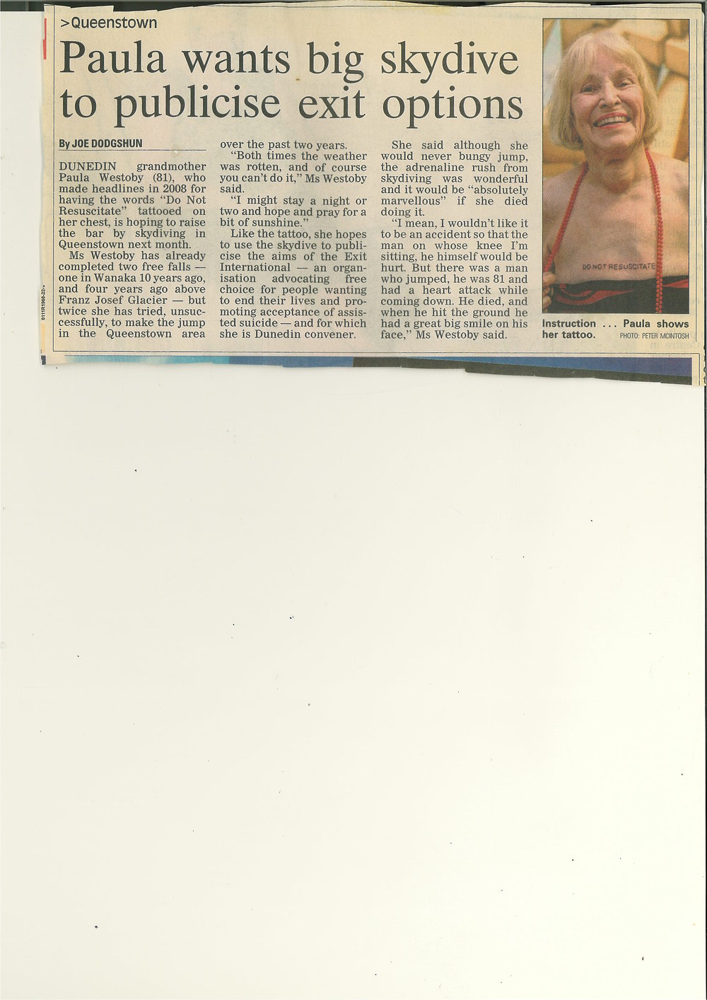 Dunedin Public Libraries (24th May 2018). Paula wants skydive to publicize exit options. In Website Dunedin Public Libraries. Retrieved 12th Apr 2026 07:09, from https://dunedin.recollect.co.nz/nodes/view/201833