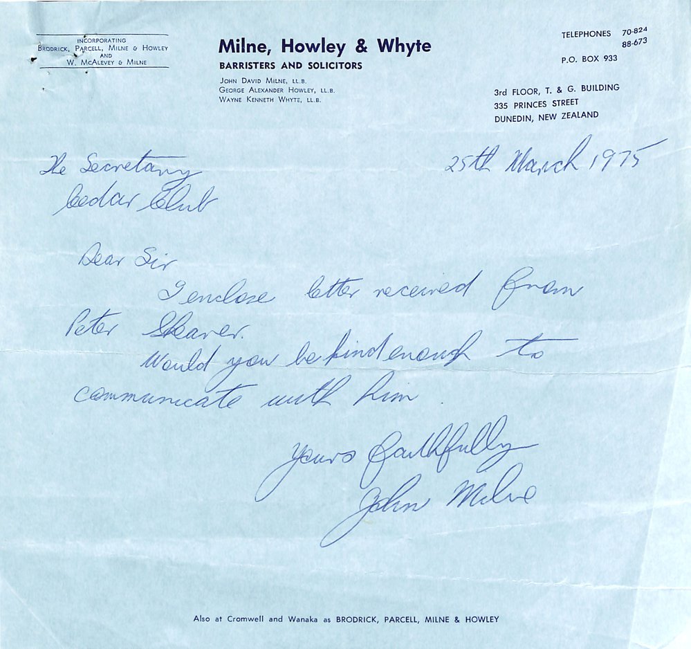Dunedin Public Libraries (1st Jul 2019). Correspondence re Visit of Douglas Anderson to Cedar's Club, Dunedin.. In Website Dunedin Public Libraries. Retrieved 19th Mar 2026 00:07, from https://dunedin.recollect.co.nz/nodes/view/202324