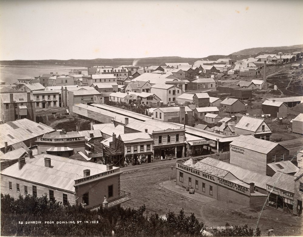 Dunedin Public Libraries (7th Apr 2021). Dunedin from Dowling Street in 1862. In Website Dunedin Public Libraries. Retrieved 19th Mar 2026 14:48, from https://dunedin.recollect.co.nz/nodes/view/206283