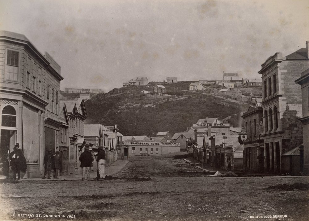 Dunedin Public Libraries (7th Apr 2021). Rattray Street, Dunedin in 1864. In Website Dunedin Public Libraries. Retrieved 19th Mar 2026 16:31, from https://dunedin.recollect.co.nz/nodes/view/206288