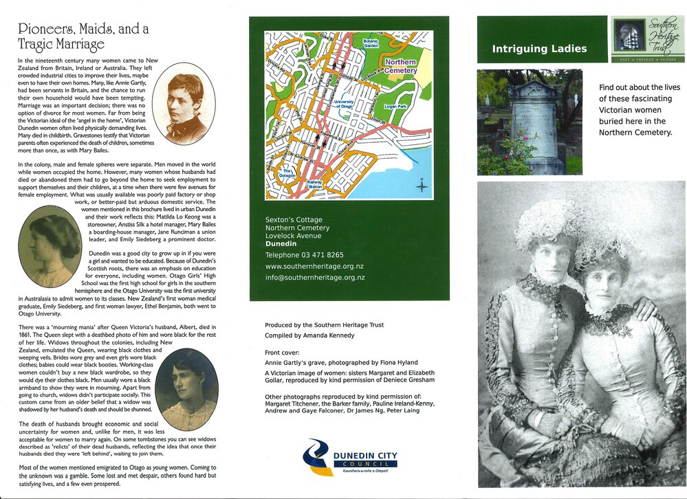 Dunedin Public Libraries (22nd Jun 2022). Southern Heritage Trust Cemetery Trails: Intriguing Ladies. In Website Dunedin Public Libraries. Retrieved 18th Mar 2026 23:47, from https://dunedin.recollect.co.nz/nodes/view/215296