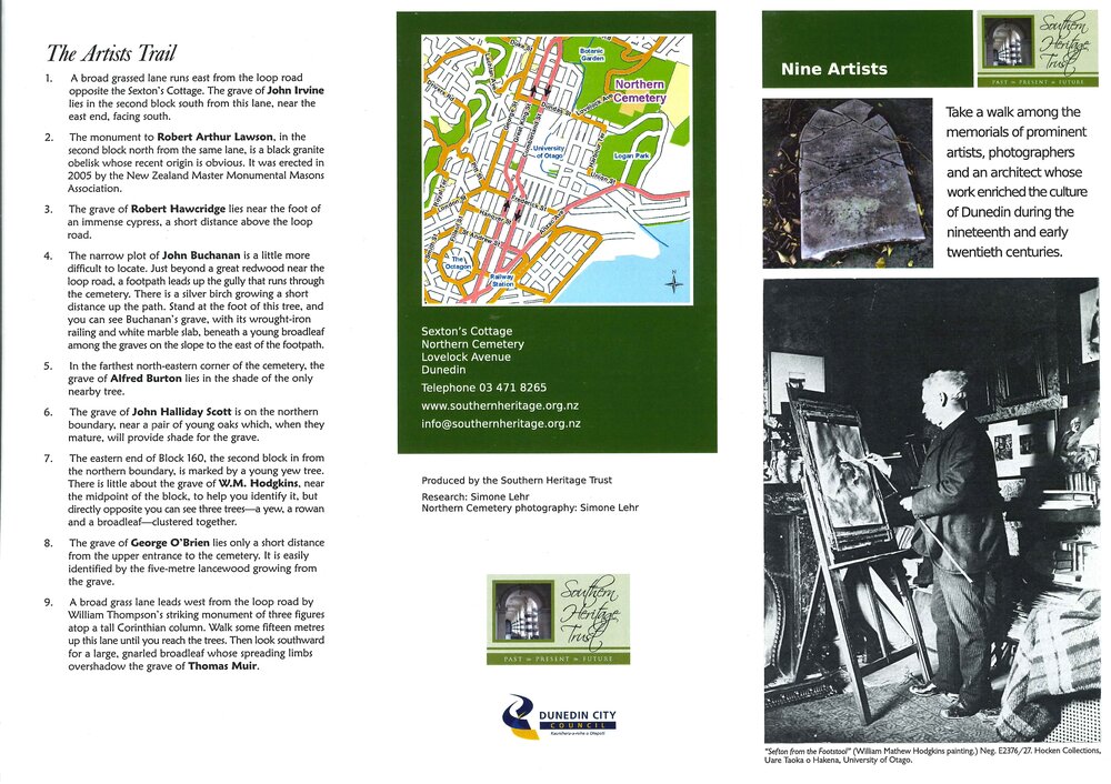Dunedin Public Libraries (22nd Jun 2022). Southern Heritage Trust Cemetery Trails: Nine Artists. In Website Dunedin Public Libraries. Retrieved 18th Mar 2026 22:36, from https://dunedin.recollect.co.nz/nodes/view/215309