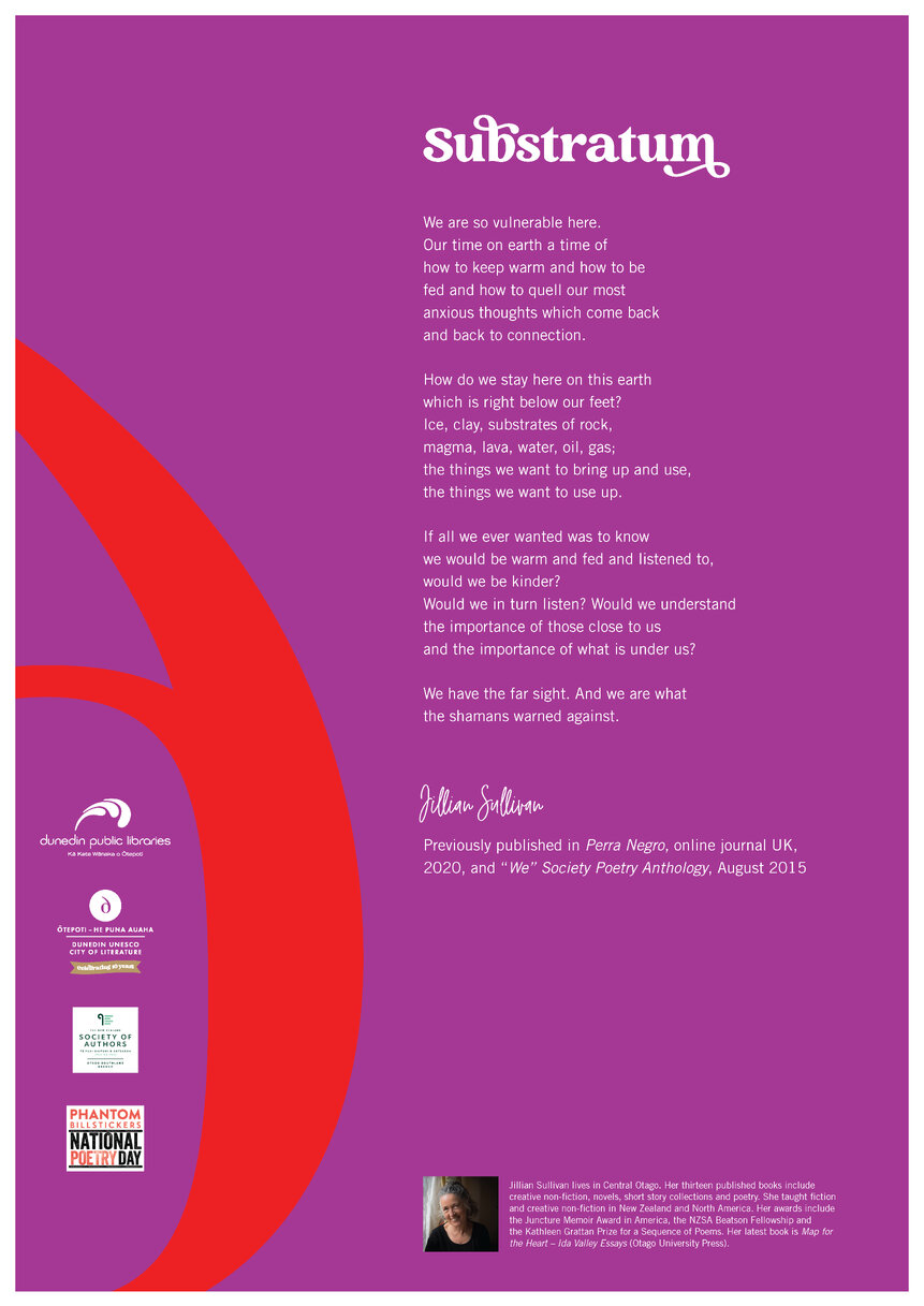 Dunedin Public Libraries (15th Jan 2025). Jillian Sullivan-National Poetry Day Poem 2024. In Website Dunedin Public Libraries. Retrieved 21st Mar 2026 04:42, from https://dunedin.recollect.co.nz/nodes/view/218286