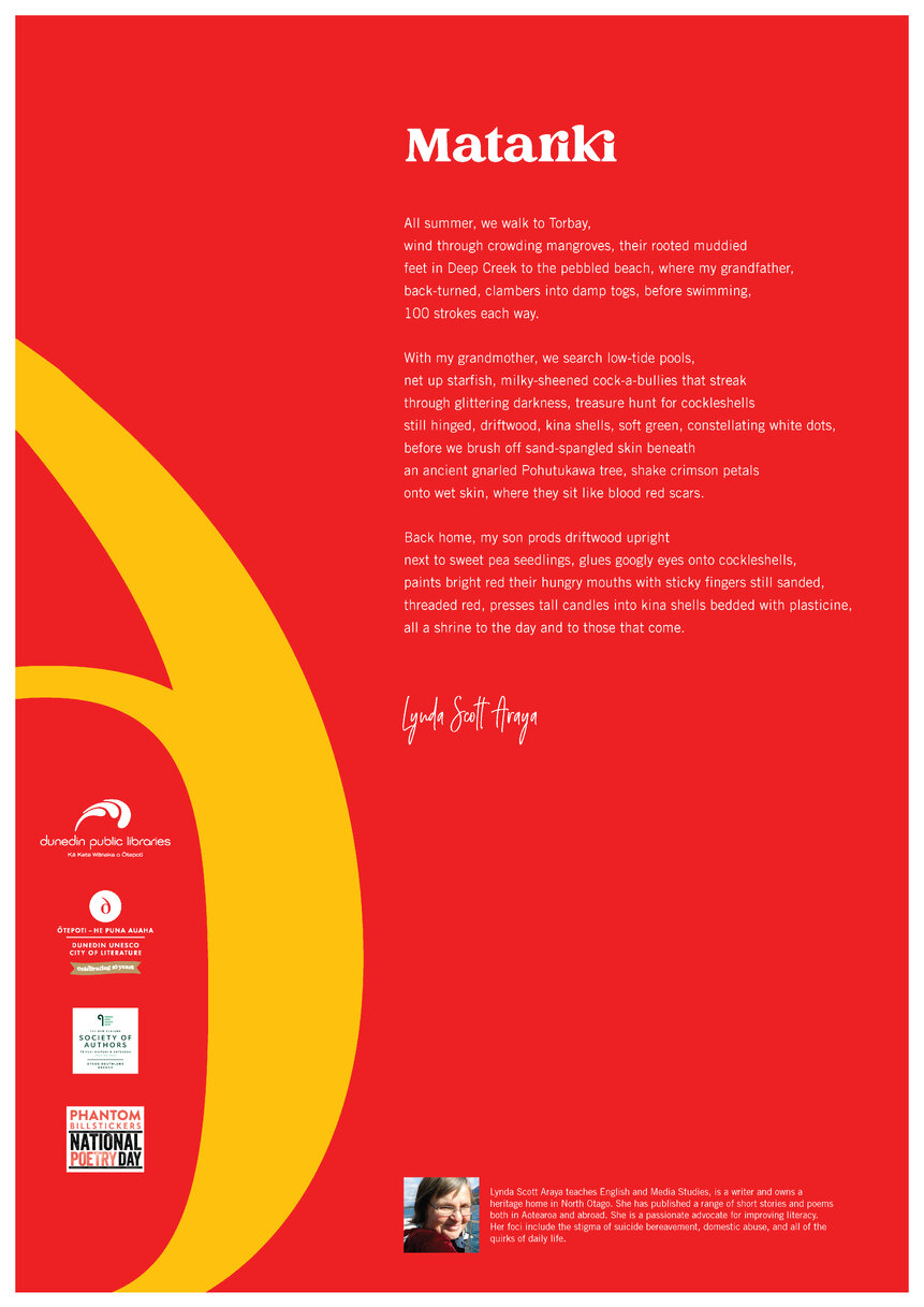 Dunedin Public Libraries (15th Jan 2025). Lynda Scott Araya-National Poetry Day Poem 2024. In Website Dunedin Public Libraries. Retrieved 21st Mar 2026 02:19, from https://dunedin.recollect.co.nz/nodes/view/218294