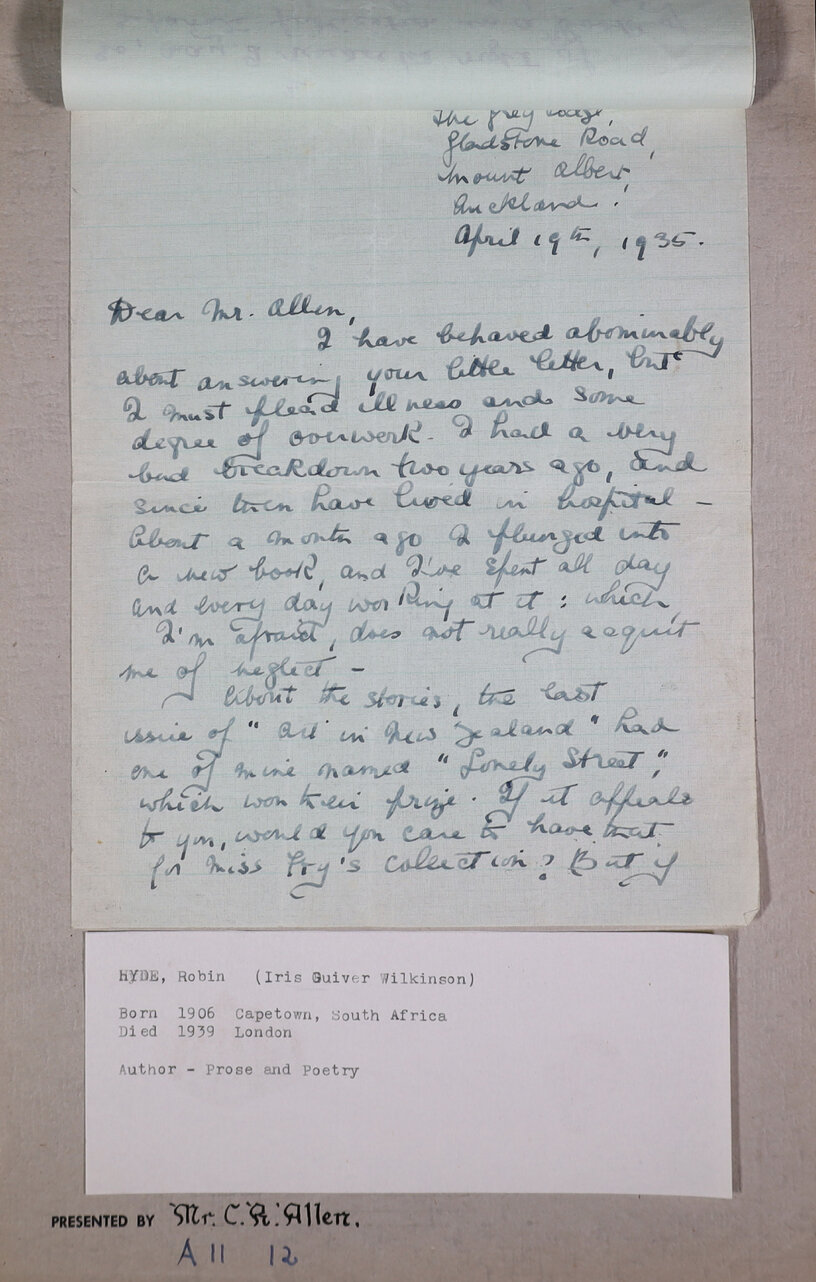 Dunedin Public Libraries (23rd Oct 2024). Correspondence from Robin Hyde to C. R. Allen. 19 April, 1935 . In Website Dunedin Public Libraries. Retrieved 20th Mar 2026 04:52, from https://dunedin.recollect.co.nz/nodes/view/218525