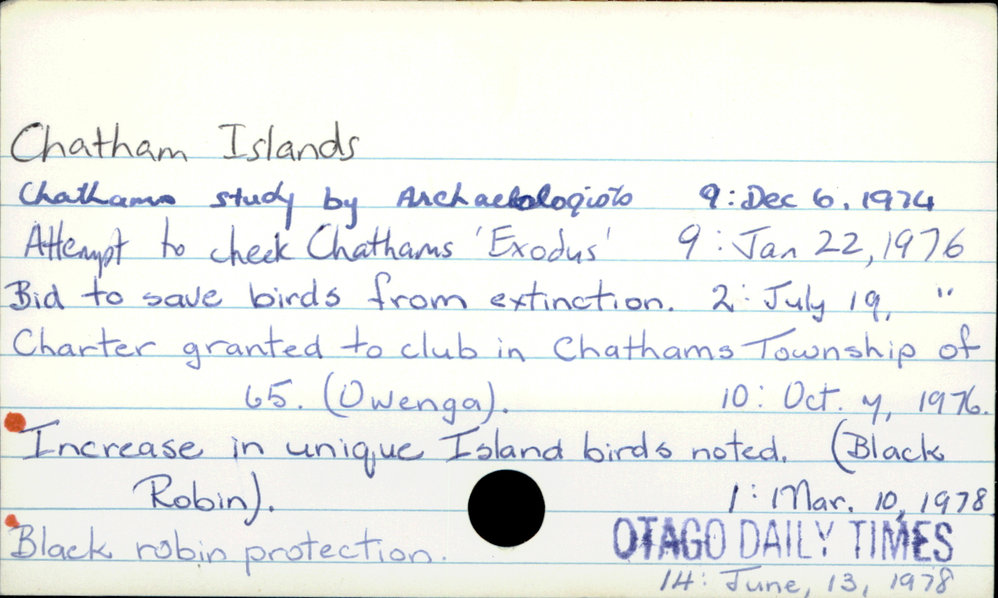 Dunedin Public Libraries (27th Mar 2019). Chatham Islands. In Website Dunedin Public Libraries. Retrieved 4th Apr 2026 15:16, from https://dunedin.recollect.co.nz/nodes/view/24661