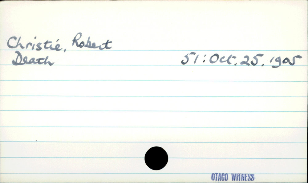Dunedin Public Libraries (4th Apr 2019). Christie, Robert. In Website Dunedin Public Libraries. Retrieved 27th Mar 2026 18:12, from https://dunedin.recollect.co.nz/nodes/view/25623