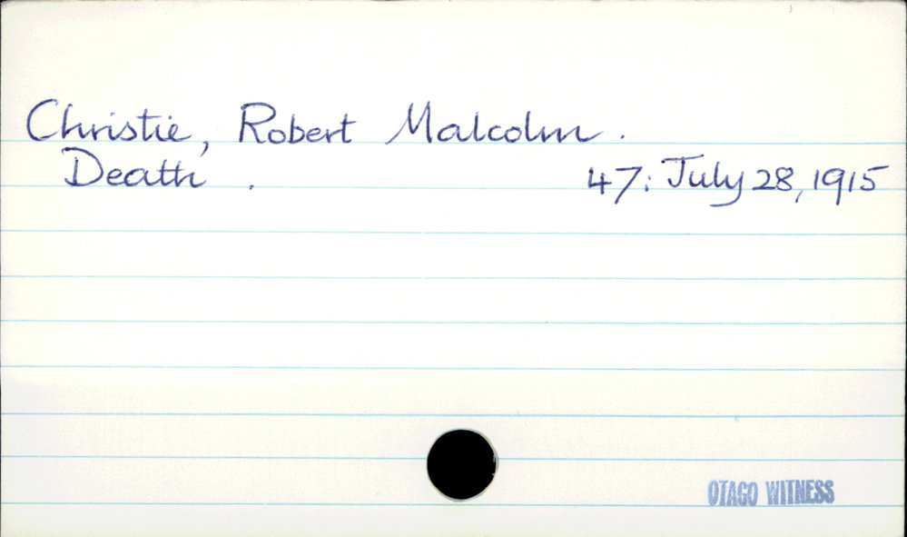 Dunedin Public Libraries (4th Apr 2019). Christie, Robert Malcolm. In Website Dunedin Public Libraries. Retrieved 27th Mar 2026 18:12, from https://dunedin.recollect.co.nz/nodes/view/25625