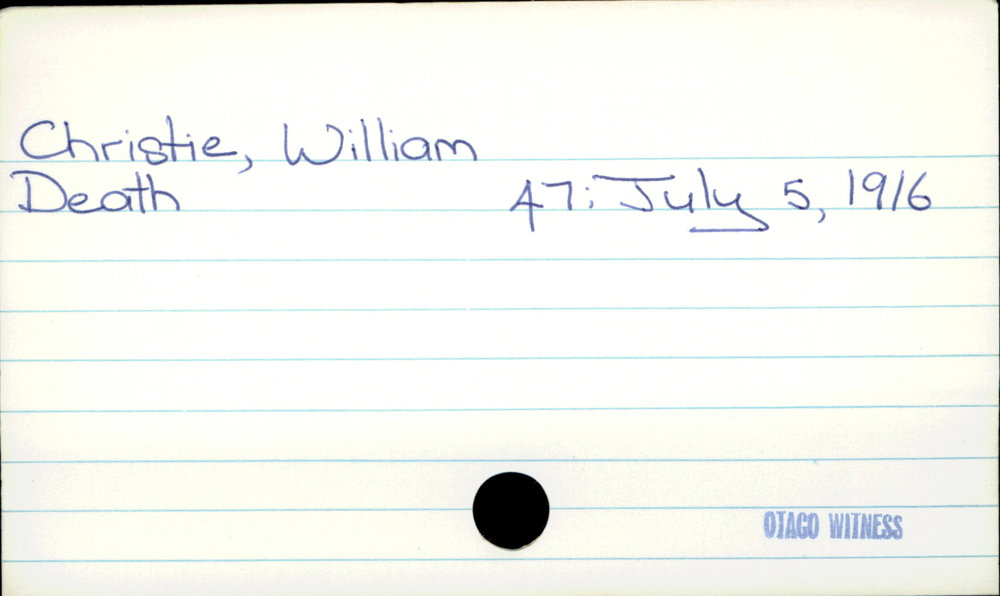 Dunedin Public Libraries (4th Apr 2019). Christie, William. In Website Dunedin Public Libraries. Retrieved 27th Mar 2026 18:12, from https://dunedin.recollect.co.nz/nodes/view/25638