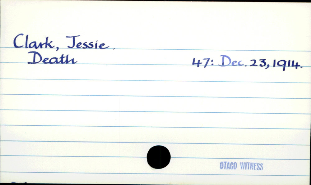 Dunedin Public Libraries (11th Apr 2019). Clark, Jessie. In Website Dunedin Public Libraries. Retrieved 27th Mar 2026 14:16, from https://dunedin.recollect.co.nz/nodes/view/26494