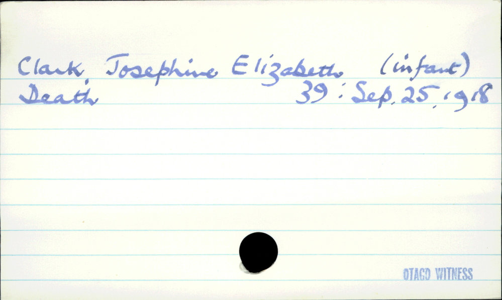 Dunedin Public Libraries (11th Apr 2019). Clark, Josephine Elizabeth (infant). In Website Dunedin Public Libraries. Retrieved 27th Mar 2026 14:16, from https://dunedin.recollect.co.nz/nodes/view/26506