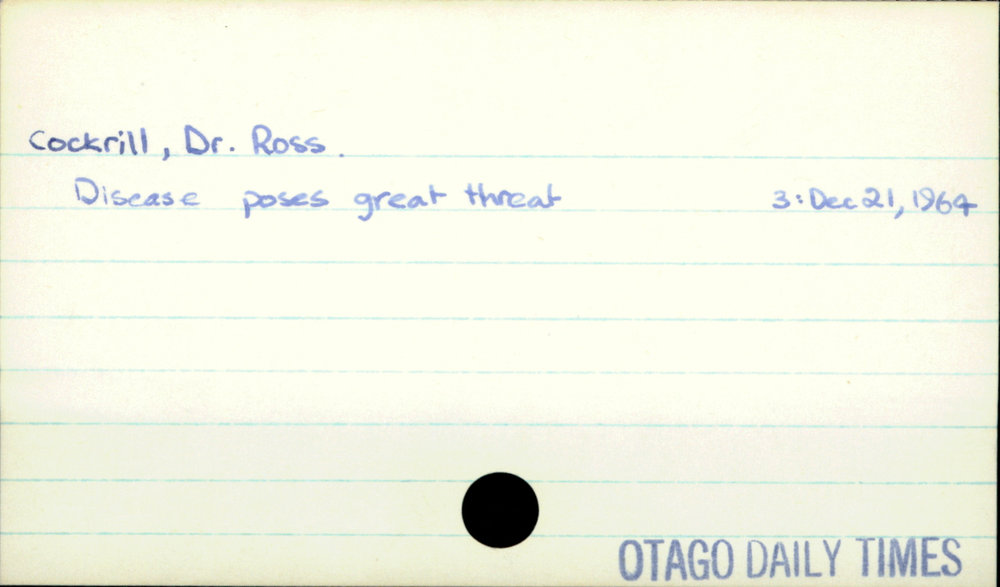 Dunedin Public Libraries (11th May 2019). Cockrill, Dr Ross.. In Website Dunedin Public Libraries. Retrieved 2nd Apr 2026 17:45, from https://dunedin.recollect.co.nz/nodes/view/28219