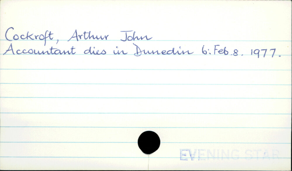 Dunedin Public Libraries (3rd May 2019). Cockroft, Arthur John. In Website Dunedin Public Libraries. Retrieved 2nd Apr 2026 17:47, from https://dunedin.recollect.co.nz/nodes/view/28220