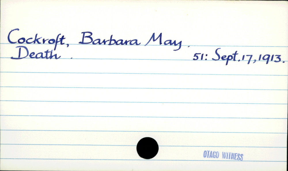 Dunedin Public Libraries (3rd May 2019). Cockroft, Barbara May. In Website Dunedin Public Libraries. Retrieved 2nd Apr 2026 17:56, from https://dunedin.recollect.co.nz/nodes/view/28221