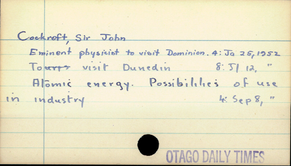 Dunedin Public Libraries (3rd May 2019). Cockroft, Sir John. In Website Dunedin Public Libraries. Retrieved 2nd Apr 2026 17:45, from https://dunedin.recollect.co.nz/nodes/view/28222