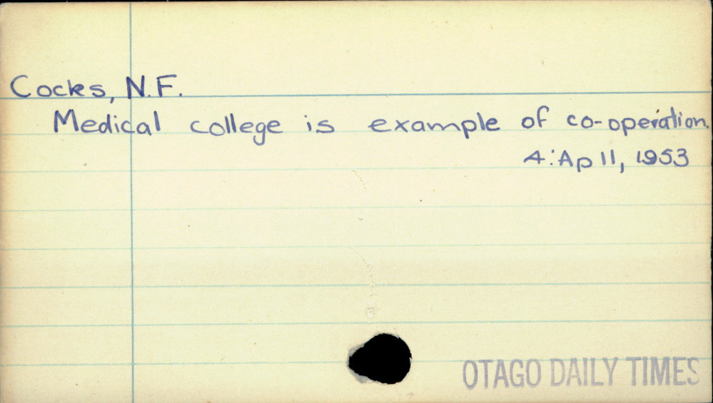 Dunedin Public Libraries (4th May 2019). Cocks, N.F.. In Website Dunedin Public Libraries. Retrieved 2nd Apr 2026 17:45, from https://dunedin.recollect.co.nz/nodes/view/28228