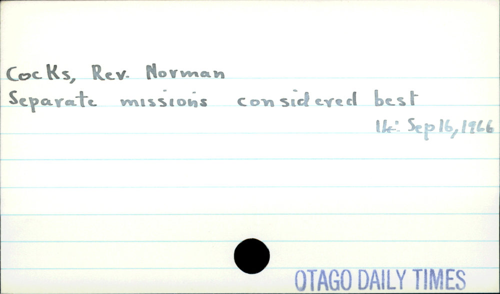 Dunedin Public Libraries (4th May 2019). Cocks, Rev. Norman. In Website Dunedin Public Libraries. Retrieved 2nd Apr 2026 17:45, from https://dunedin.recollect.co.nz/nodes/view/28229