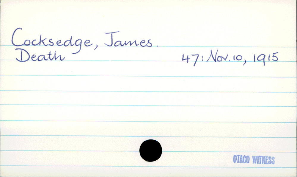 Dunedin Public Libraries (4th May 2019). Cocksedge, James. In Website Dunedin Public Libraries. Retrieved 2nd Apr 2026 17:45, from https://dunedin.recollect.co.nz/nodes/view/28231