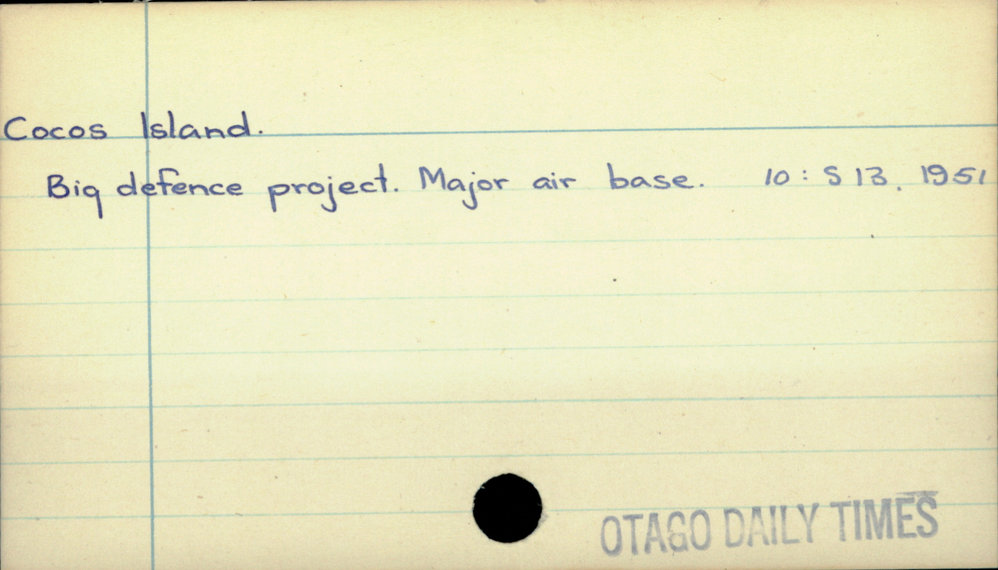 Dunedin Public Libraries (4th May 2019). Cocos Island. In Website Dunedin Public Libraries. Retrieved 2nd Apr 2026 17:56, from https://dunedin.recollect.co.nz/nodes/view/28233