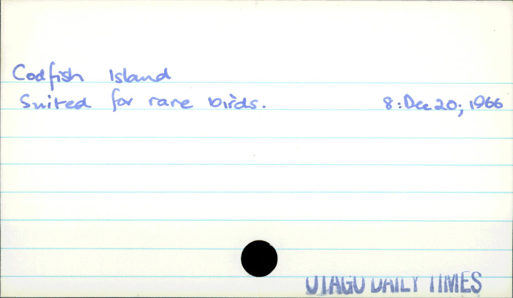 Dunedin Public Libraries (4th May 2019). Codfish Island. In Website Dunedin Public Libraries. Retrieved 2nd Apr 2026 17:46, from https://dunedin.recollect.co.nz/nodes/view/28235