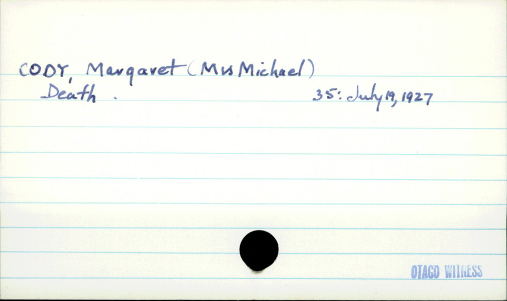 Dunedin Public Libraries (4th May 2019). CODY, Margaret (Mrs Michael). In Website Dunedin Public Libraries. Retrieved 2nd Apr 2026 17:46, from https://dunedin.recollect.co.nz/nodes/view/28238