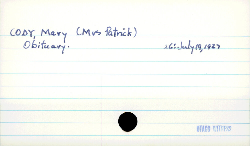 Dunedin Public Libraries (4th May 2019). CODY, Mary (Mrs Patrick). In Website Dunedin Public Libraries. Retrieved 2nd Apr 2026 17:56, from https://dunedin.recollect.co.nz/nodes/view/28239