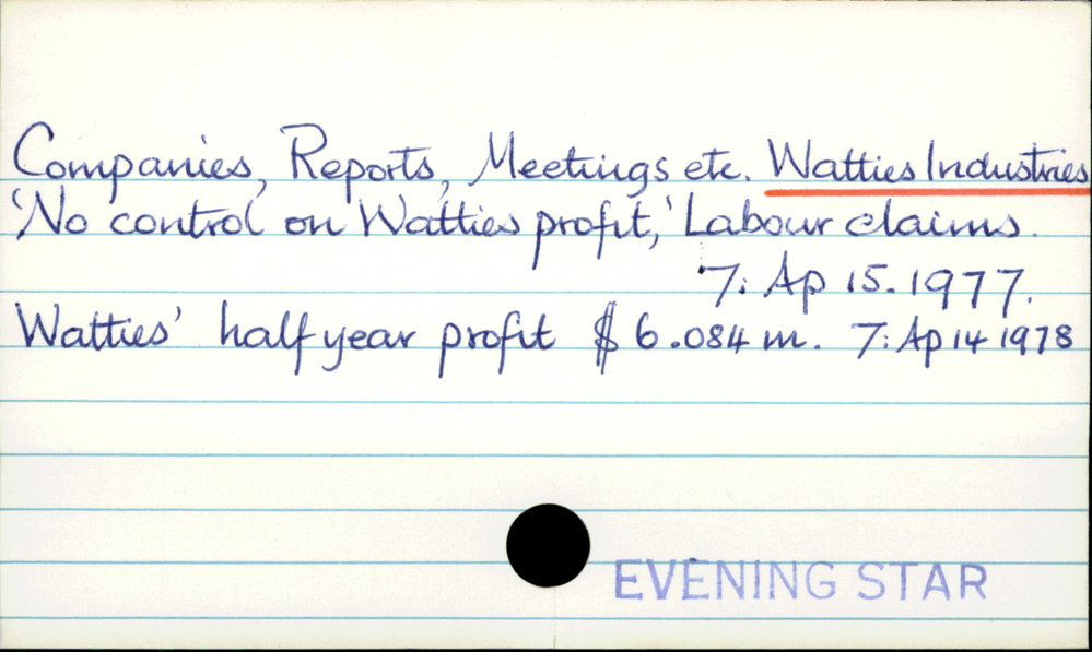 Dunedin Public Libraries (15th May 2019). Companies, Reports, Meetings, etc - Watties Industries. In Website Dunedin Public Libraries. Retrieved 2nd Apr 2026 21:40, from https://dunedin.recollect.co.nz/nodes/view/29173