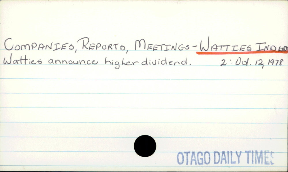 Dunedin Public Libraries (23rd May 2019). Companies, Reports, Meetings, etc - Watties Industries. In Website Dunedin Public Libraries. Retrieved 2nd Apr 2026 21:40, from https://dunedin.recollect.co.nz/nodes/view/29174