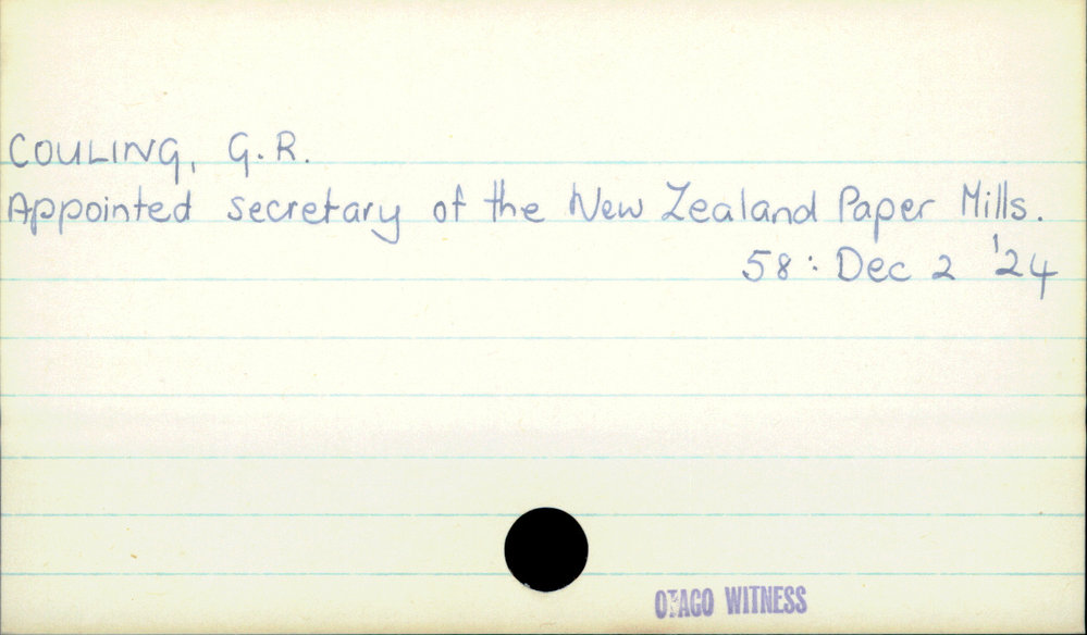 Dunedin Public Libraries (5th Jun 2019). COULING, G. R.. In Website Dunedin Public Libraries. Retrieved 4th Apr 2026 04:44, from https://dunedin.recollect.co.nz/nodes/view/31043