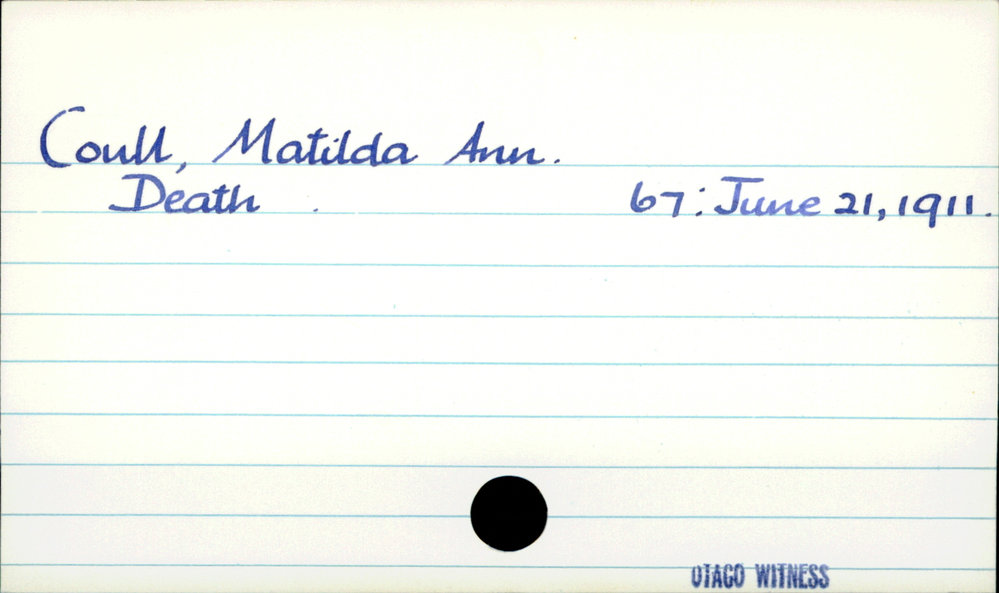 Dunedin Public Libraries (4th Jun 2019). Coull, Matilda Ann. In Website Dunedin Public Libraries. Retrieved 4th Apr 2026 04:49, from https://dunedin.recollect.co.nz/nodes/view/31046