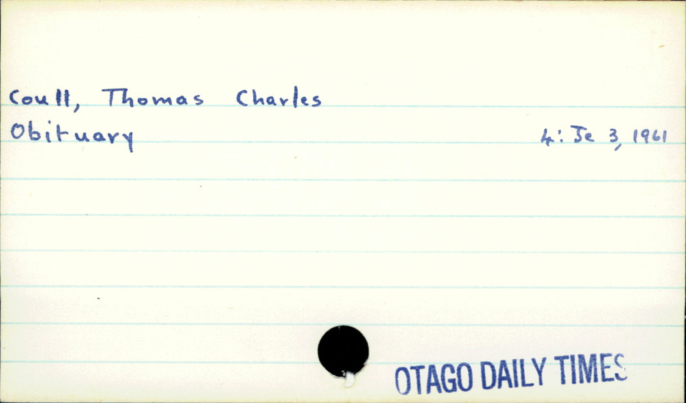 Dunedin Public Libraries (4th Jun 2019). Coull, Thomas Charles. In Website Dunedin Public Libraries. Retrieved 4th Apr 2026 04:44, from https://dunedin.recollect.co.nz/nodes/view/31048